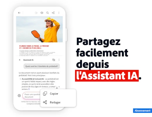Allez au-delà de la simple gestion avec les capacités avancées d'Acrobat Reader. Explorez les fonctionnalités révolutionnaires de l'Assistant IA d'Adobe Acrobat pour interroger vos documents par voix ou texte, obtenir des résumés générés par IA, et même extraire des informations détaillées de diagrammes et graphiques grâce à Figures Q&A. Modifiez le texte et les images de vos PDF, organisez vos pages, convertissez des documents Microsoft ou des images en PDF, et protégez vos fichiers par mot de passe. Bénéficiez d'un essai gratuit de 7 jours pour découvrir ces outils puissants.