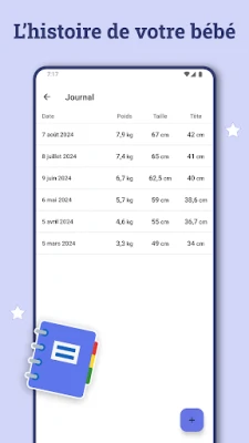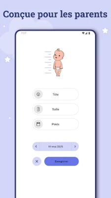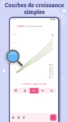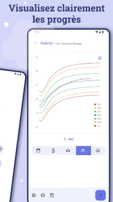 Au cœur de ses capacités, cet outil offre une suite complète pour un suivi précis. Visualisez sans effort les trajectoires de croissance grâce à l'intégration des courbes de l'Organisation Mondiale de la Santé (OMS), assurant une référence universellement reconnue et fiable. Enregistrez et analysez l'évolution pondérale, surveillez de près le développement statural, et mesurez le périmètre crânien – des indicateurs cruciaux pour une croissance cérébrale saine. L'application enrichit également cette surveillance en calculant automatiquement le rapport poids-taille et l'Indice de Masse Corporelle (IMC), fournissant une vue équilibrée sur la proportionnalité de la croissance de votre enfant.