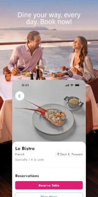 Une fois à bord, la liberté est totale. Connectez-vous sans frais au réseau internet du navire pour une utilisation fluide de l'application Norwegian Cruise Line. Accédez instantanément au "Freestyle Daily" pour ne rien manquer des événements du jour. Parcourez les menus alléchants, ajustez vos réservations de dîner ou découvrez de nouvelles excursions pour explorer nos destinations. Suivez en temps réel vos dépenses et achats, et assurez-vous de profiter de chaque spectacle et activité. Avec "Mes Plans", toutes vos prochaines aventures sont clairement définies, pour une exploration et une détente sans interruption.