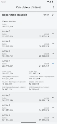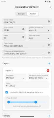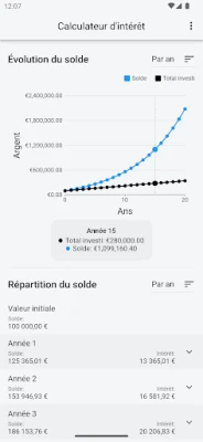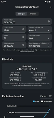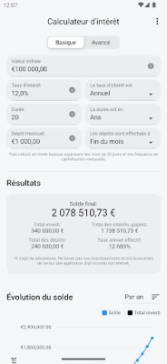 La prise en main est intuitive grâce à son "Mode Simple". Saisissez simplement votre mise de départ (si applicable), ajoutez un versement mensuel facultatif, définissez le taux d'intérêt et la durée de votre investissement. En un instant, cette application transforme ces données en un graphique clair et une analyse détaillée, vous offrant une compréhension immédiate de la performance de vos fonds sur la période choisie.
